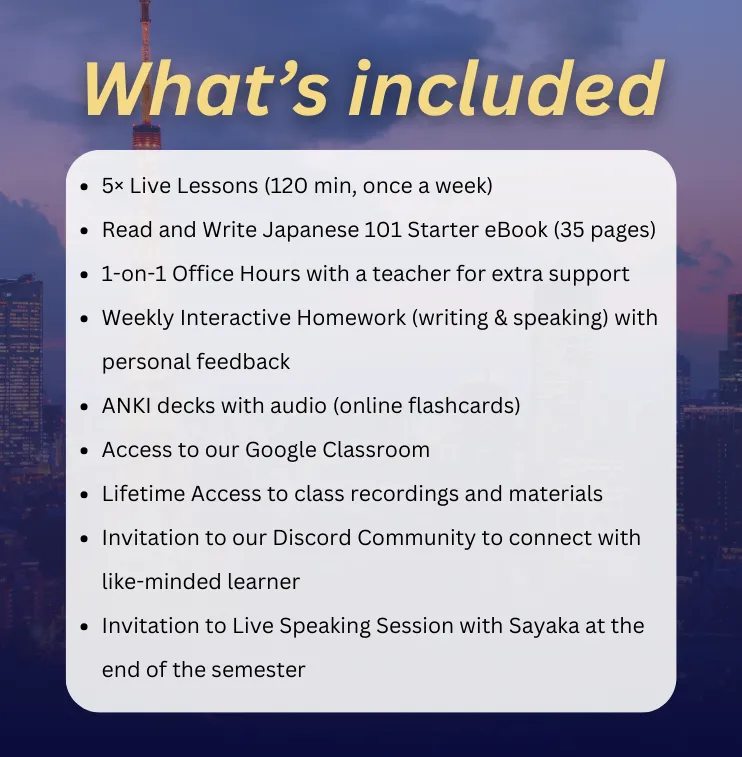 This course is valued at $845 USD, BUT you can join today for our special price of $385 USD (+ transaction fee). We’ve kept this beginner course as accessible as possible because it’s the very first step in your Japanese learning journey, and I want to make it easier for motivated learners to start strong. Your enrollment includes 10 hours of live classes with two teachers, a final 2-hour speaking session with Sayaka, a 75-minute 1-on-1 office hour in total, our Read & Write Japanese 101 Starter eBook (35 pages), ANKI decks with audio, lifetime community access, and extra learning bonuses.