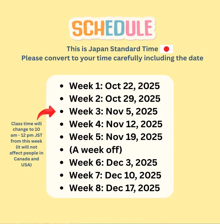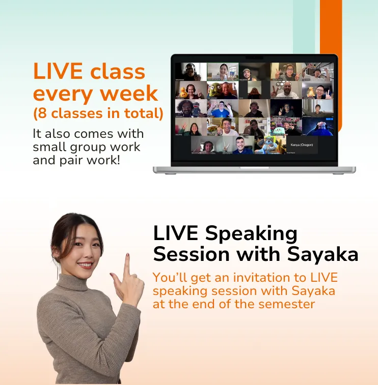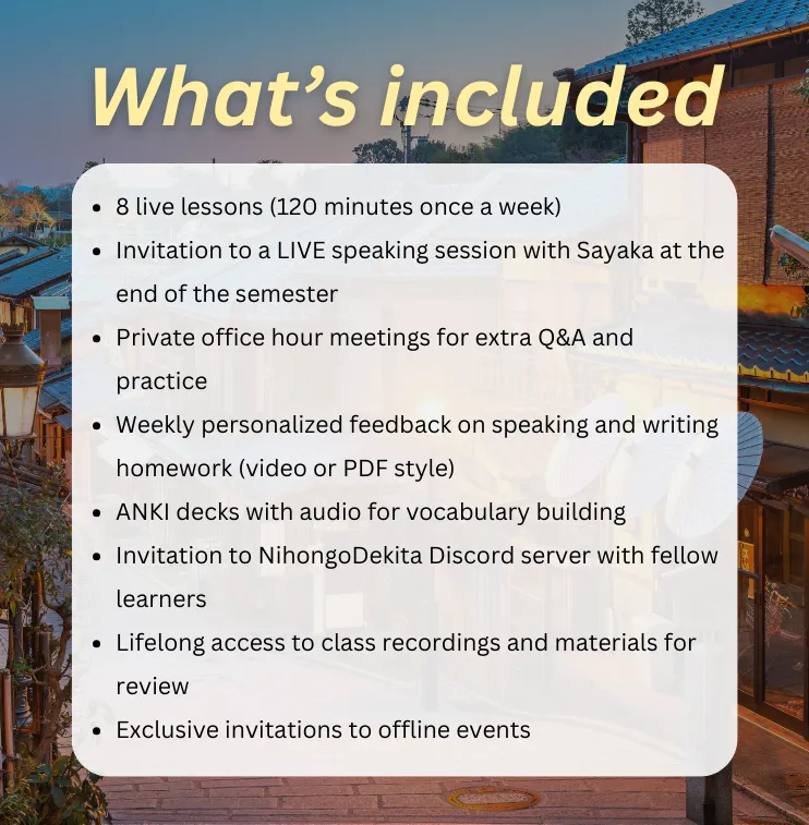 Your enrollment includes 16 hours of live classes, a final 2-hour speaking session with Sayaka, 1-on-1 office hours, interactive homework with feedback, PDF resources and flashcards with audio, and lifetime access to recordings and our global community.