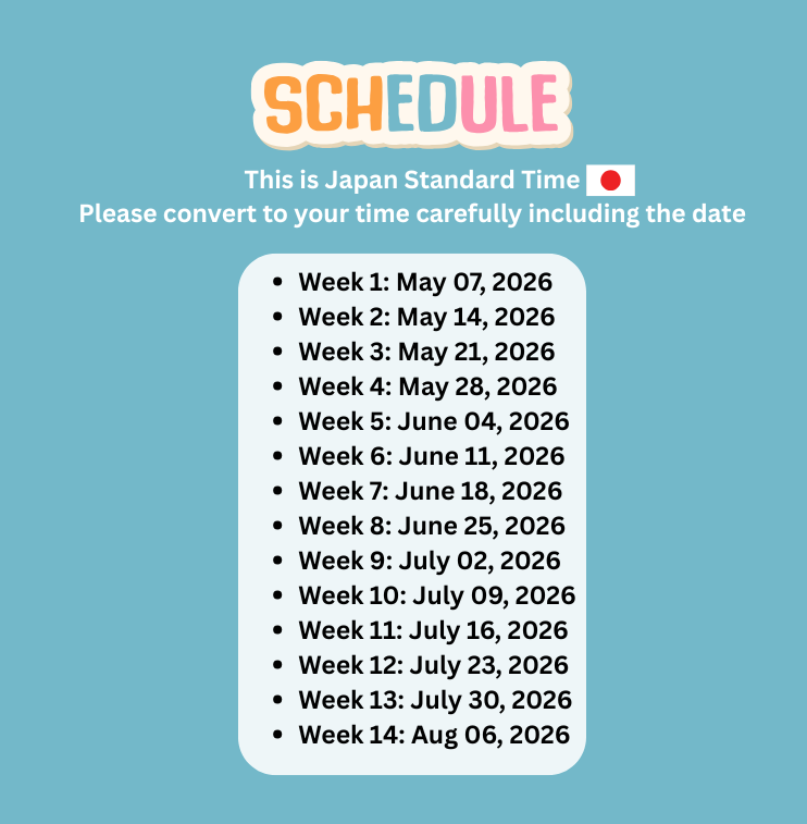Your enrollment includes 28 hours of live lessons, a final 2-hour speaking session with Sayaka, 1-on-1 office hours, weekly homework with personalized feedback, supplemental resources and flashcards, and lifetime access to recordings and our supportive global community.