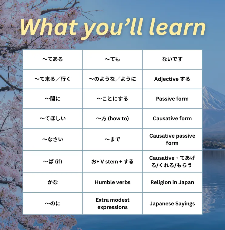 This course is designed for learners who want to express more nuanced ideas in conversations and expand their intermediate Japanese skills.