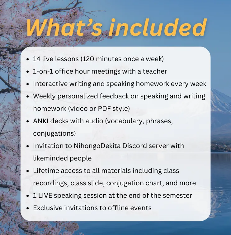 Your enrollment includes 28 hours of live lessons, a final 2-hour speaking session with Sayaka, 1-on-1 office hours, weekly homework with personalized feedback, supplemental resources and flashcards, and lifetime access to recordings and our supportive global community.